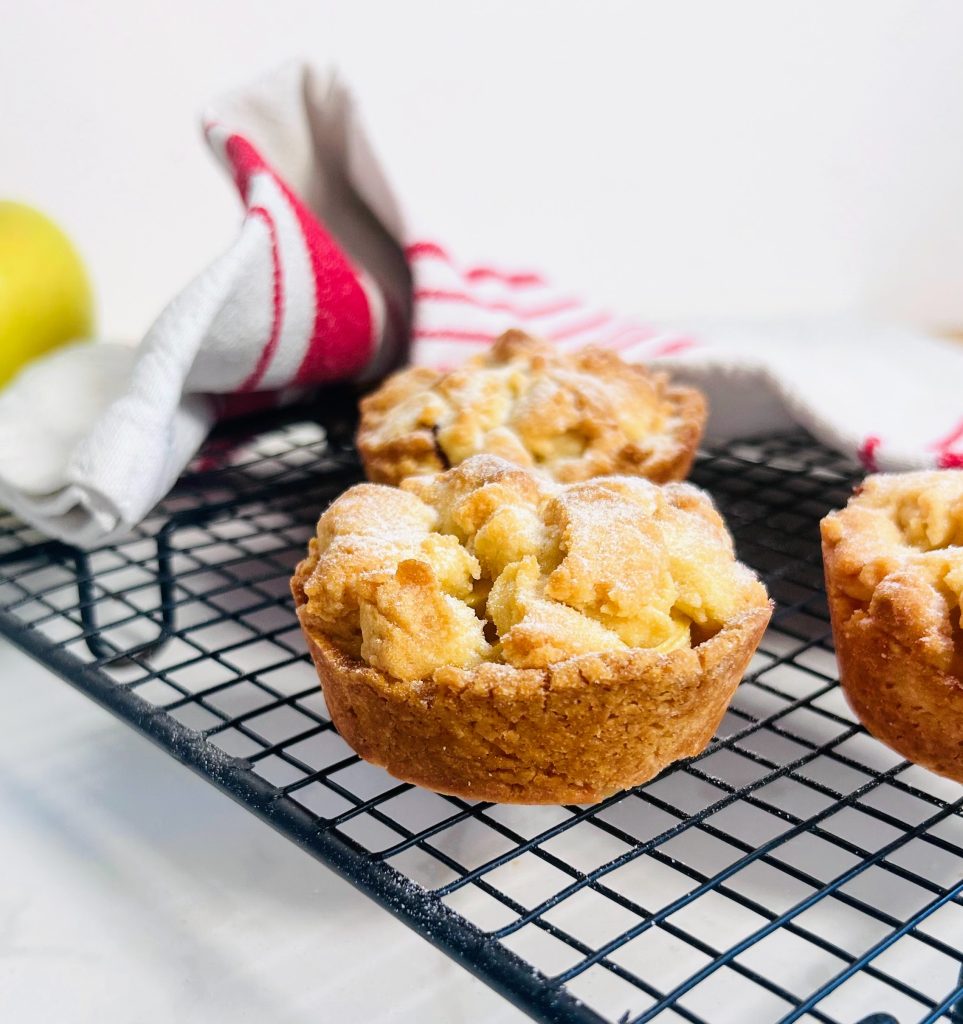 Backen Sie die Miniküchlein bei 180°C für 20-25 Minuten oder bis der Crumble goldbraun und die Äpfel weich sind.