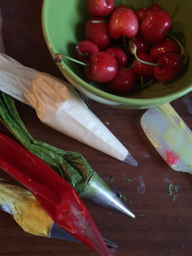 Nehmen Sie so viele Schälchen, wie Farben für das Design benötigt werden, sowie ebenso viele Spritzbeutel.