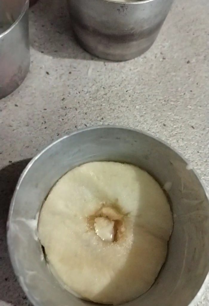Die Förmchen mit Öl einfetten (meine sind 5,5 cm hoch und haben einen Durchmesser von 7,5 cm), mit Mehl bestäuben. Jetzt schichten Sie die Zutaten, indem Sie mit einem Löffel Teig beginnen.