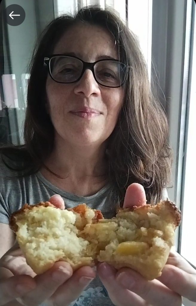 Jetzt legen Sie ein oder zwei Apfelscheiben darauf, dann wieder einen Löffel Teig, ein oder zwei Apfelscheiben und schließlich mehr Teig. Lassen Sie die Apfelscheiben im Teig versinken, um zu vermeiden, dass sich der Muffin nach dem Backen in zwei Teile teilt. Mit diesen Mengen erhalten Sie sechs Muffins. Wenn die Förmchen zu voll erscheinen, fügen Sie ein weiteres hinzu. Sie erhalten ziemlich große Muffins, wenn Sie kleinere bevorzugen, verwenden Sie kleinere Förmchen.