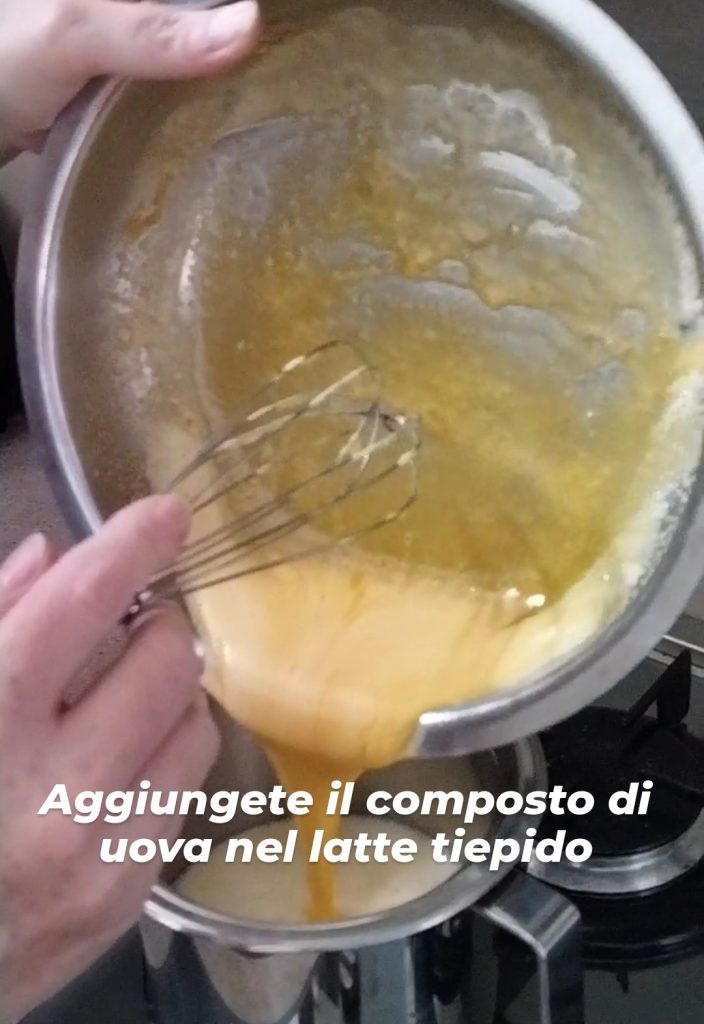 Fügen Sie die Eimischung zur heißen Milch hinzu, die jedoch nicht kochen darf, und kochen Sie unter Rühren mit dem Schneebesen. Schalten Sie die Mischung ab, wenn sie eine Temperatur von 82-85 °C erreicht, sie darf nicht kochen, sonst besteht die Gefahr, dass sie gerinnt.