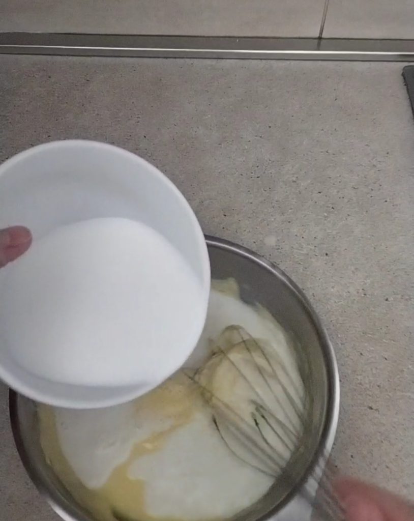 Geben Sie die Eigelbe und den Zucker in eine Schüssel. Schlagen Sie sie mit einem Schneebesen, bis die Mischung schaumig wird. Beiseitestellen.