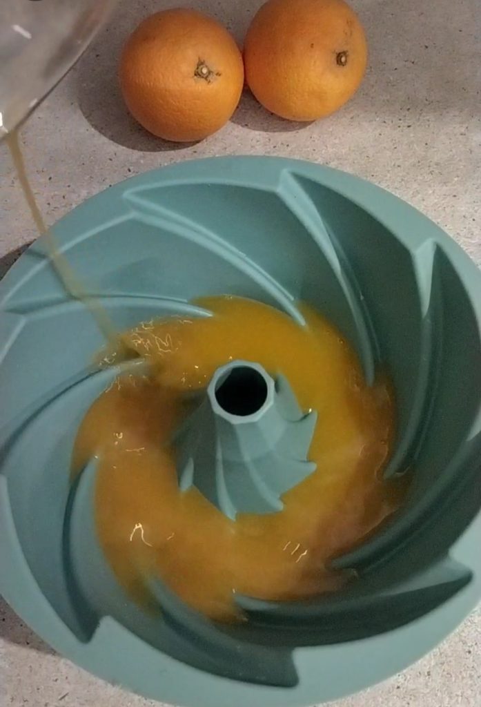 Übertragen Sie alles in die Silikonform, in die Sie bereits das Orangengelee gegossen haben, das mittlerweile vollständig fest geworden sein sollte. Lassen Sie es für einige Stunden im Kühlschrank abkühlen (mindestens fünf oder sechs Stunden, besser die ganze Nacht).