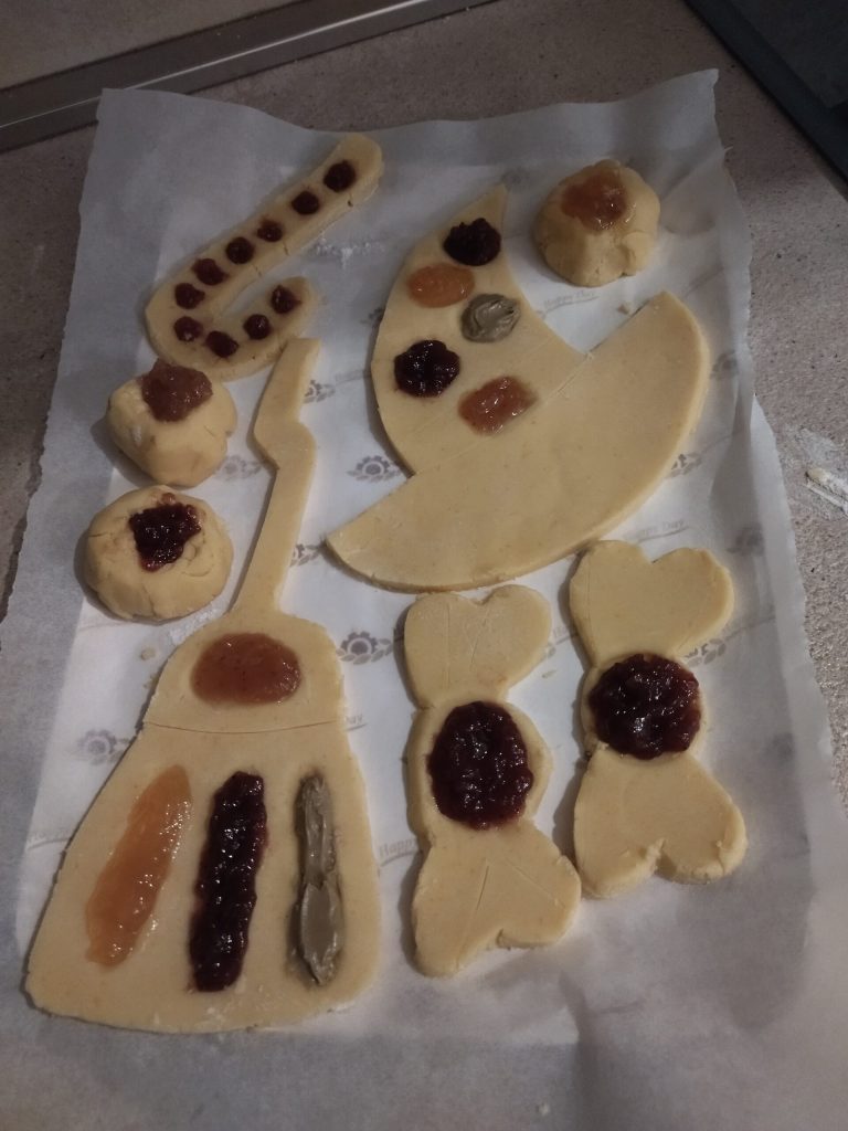 Der Besen ist 9 cm breit und 12 cm hoch, der Stiel ist 12 cm lang. Dies nur zur Verdeutlichung der Größen der Formen. Legen Sie die Formen auf den ausgerollten Teig und schneiden Sie sie mit einem Messer aus.