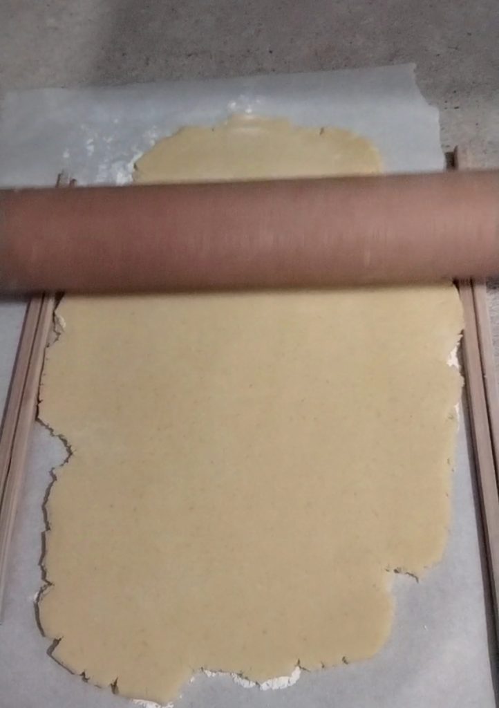 Nehmen Sie den Teig aus dem Kühlschrank, legen Sie ihn auf ein mit Mehl bestäubtes Backpapier und rollen Sie ihn mit einem Nudelholz auf etwa 0,5 cm Dicke aus.