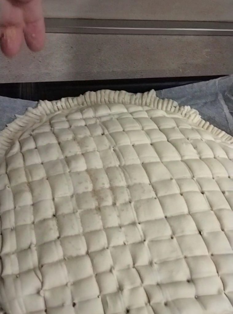 Schneiden Sie mit einem Pizzaschneider oder einem Messer ein Gitter auf die Oberfläche des Blätterteigs.