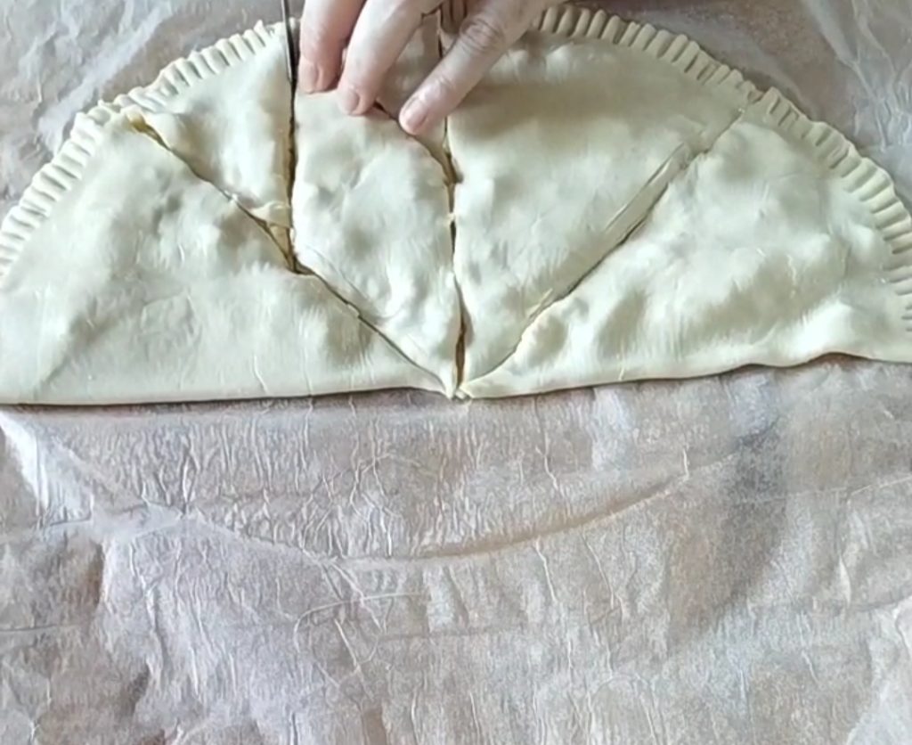 Wie kann man einfach und schnell Dreiecke aus einem Kreis oder Halbkreis ausschneiden? Hier ist die Lösung für Sie, es wird Ihnen in kurzer Zeit leckere kleine Gebäcke geben, die einfach zuzubereiten sind. Diese Blätterteigdreiecke gefüllt mit Äpfeln und Marmelade sind in einem Bissen zu genießen.