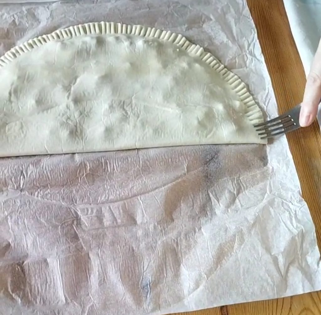 Falten Sie die andere Hälfte des Blätterteigs um und schließen Sie den Rand gut mit einer Gabel.