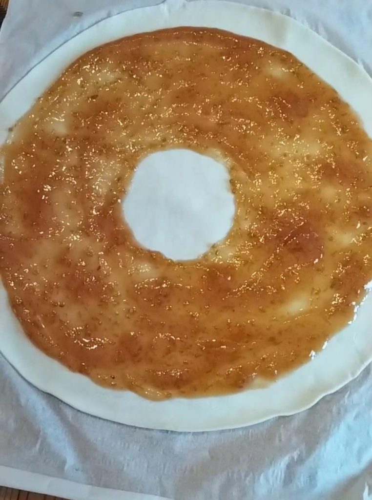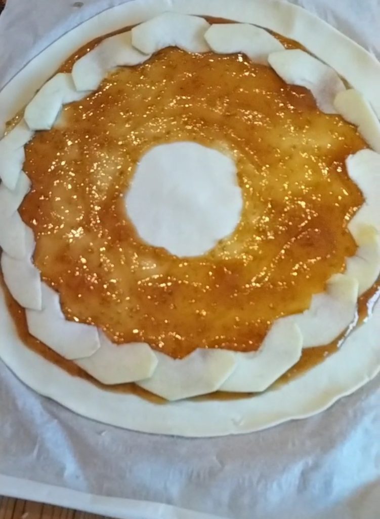 Rollen Sie den runden Blätterteig direkt auf dem mit Backpapier ausgelegten Backblech aus. Verteilen Sie die Marmelade gleichmäßig darauf, lassen Sie die Mitte und etwa zwei Zentimeter Rand frei.