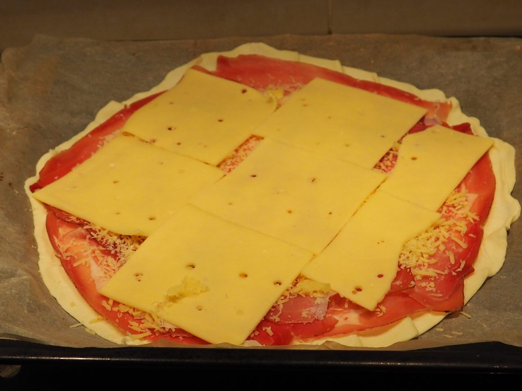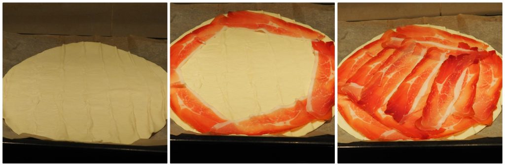 Entrollen Sie den ersten Blätterteig, legen Sie ihn auf ein Backpapier, das bereits auf dem Backblech liegt, und bedecken Sie ihn mit den Speckscheiben.