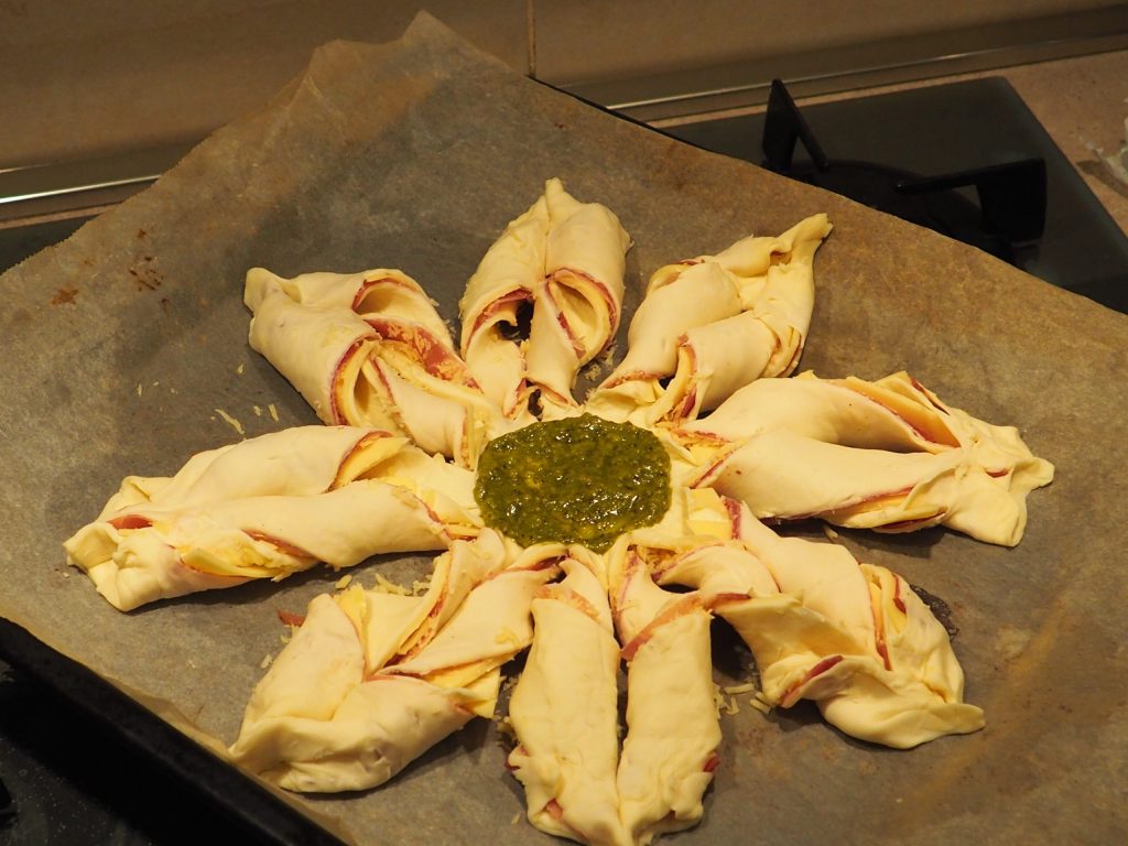 In die Mitte können Sie anstelle des Pestos auch Sesamsamen, gehackte schwarze Oliven oder nichts geben.