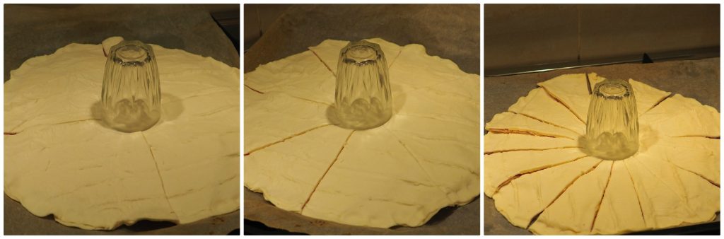 Setzen Sie ein Glas in die Mitte, schneiden Sie mit einer Schere oder einem Messer zuerst in vier Teile, dann in 8 und schließlich in 16 Stücke.