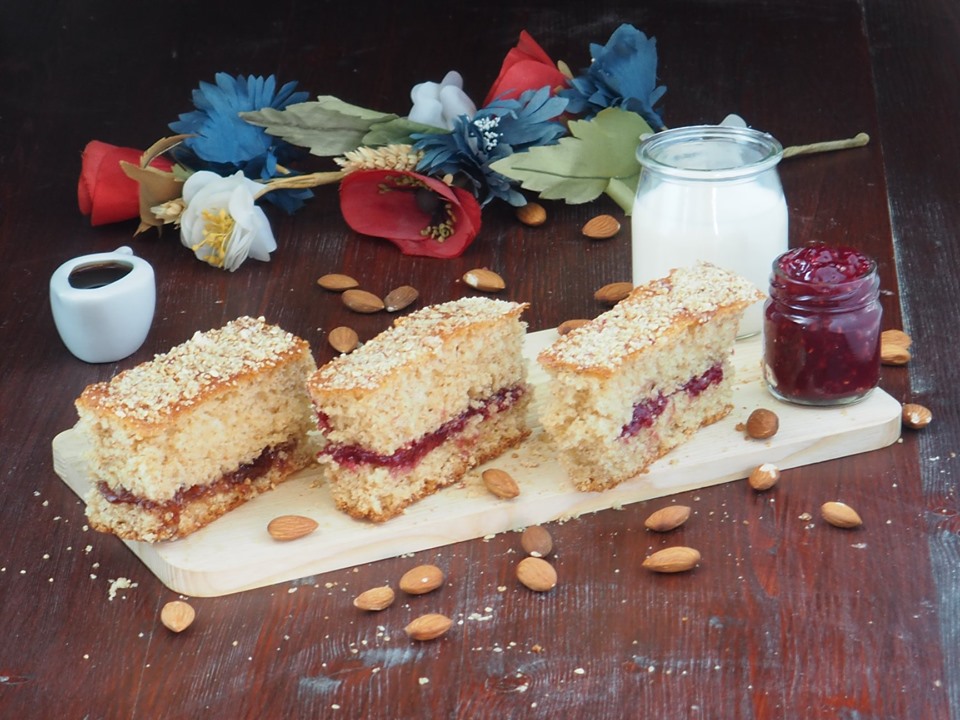 Bestreichen Sie eine Schicht mit dem Joghurt und die andere Schicht mit der Marmelade.
