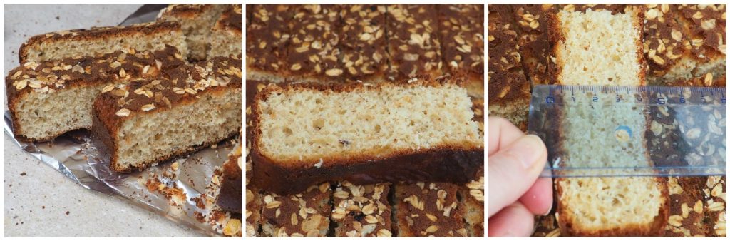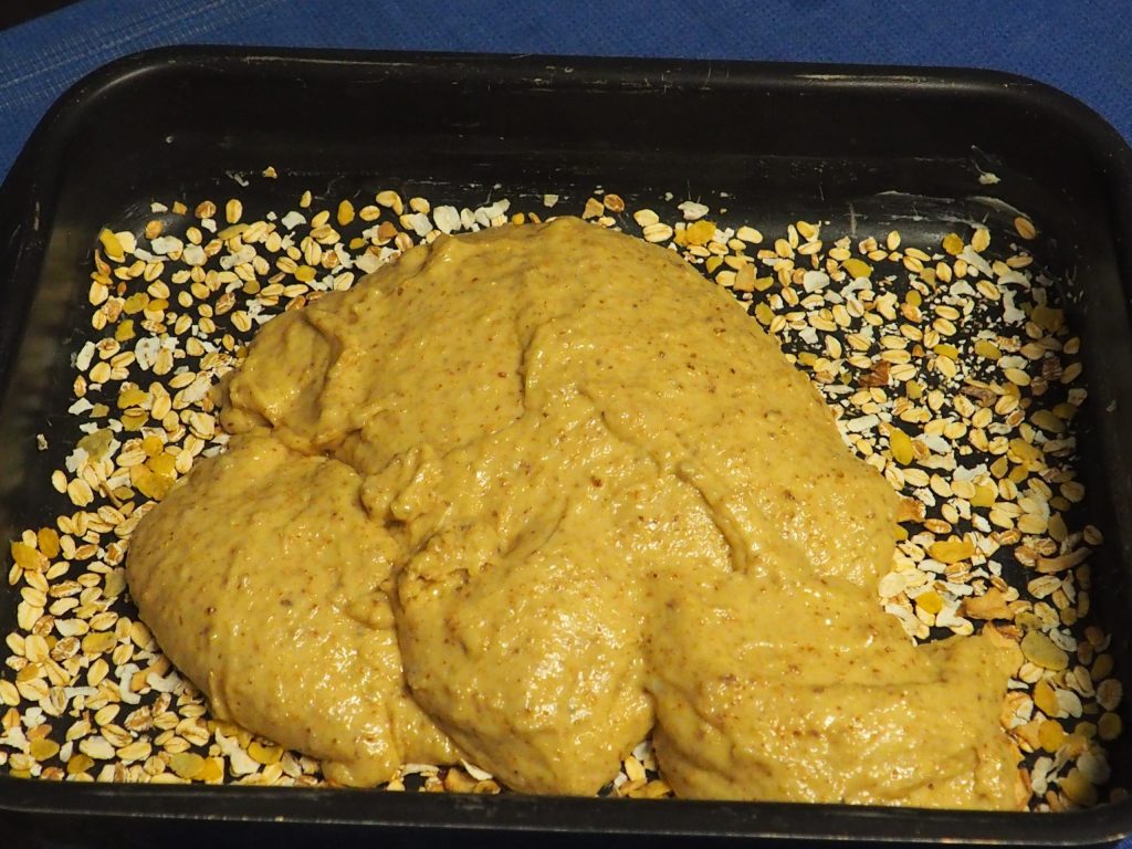 Nehmen Sie ein Backblech von 23×30 cm, fetten Sie es mit Butter ein und bestreuen Sie es mit dem zuvor gehackten Müsli (Sie können auch Haferflocken verwenden).