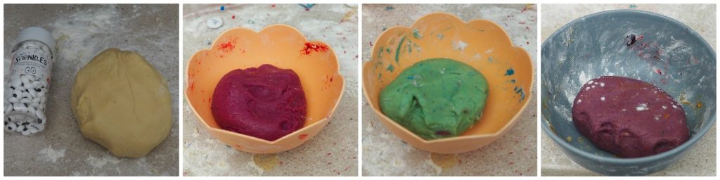 Fügen Sie nun die Lebensmittelfarben hinzu: Pulverfarben sind vorzuziehen, wenn Sie flüssige Farben verwenden, fügen Sie auch etwas Mehl hinzu, sonst wird der Teig zu weich. Die Konsistenz sollte wie Knetmasse sein: weich und formbar, leicht klebrig.