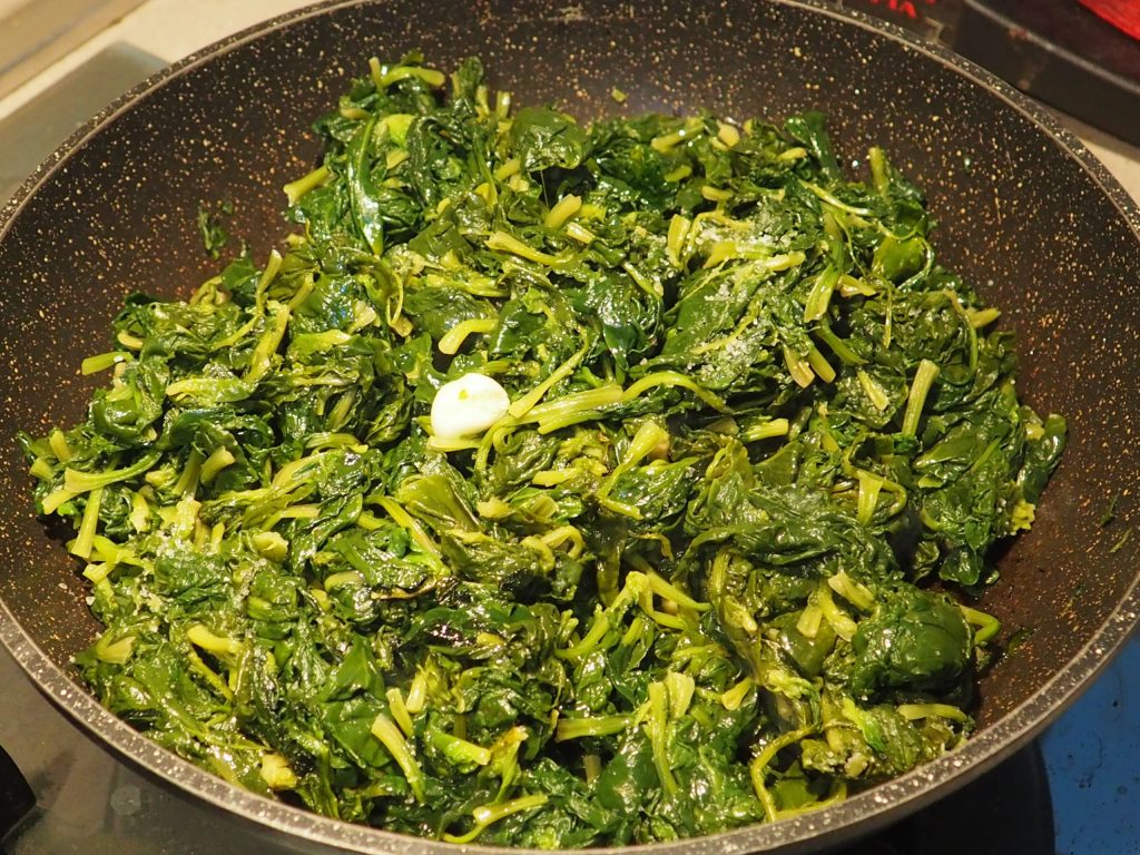 Geben Sie etwas Olivenöl und eine Knoblauchzehe in eine Pfanne, fügen Sie den Spinat hinzu und braten Sie ihn für ein paar Minuten an.