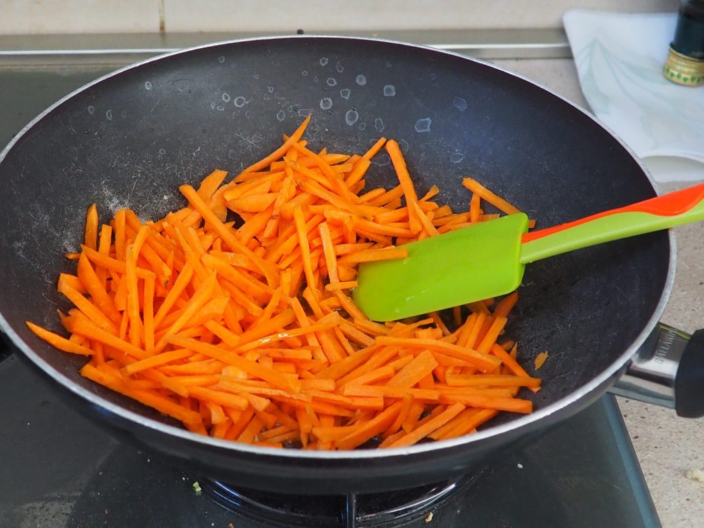 In einem Wok das Olivenöl erhitzen, die Karotten dazugeben und etwa 5 Minuten kochen lassen.