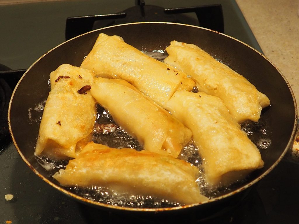 Reichlich Öl in eine Pfanne geben, wenn es heiß ist, eure Rollen für ein paar Minuten frittieren, sie von beiden Seiten wenden, bis sie goldbraun sind.