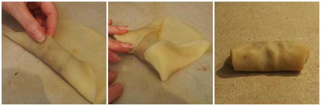Den unteren Teil rollen, um die Füllung zu verschließen, die beiden Seiten umklappen und etwas Paste darauf geben, die als Kleber dient.