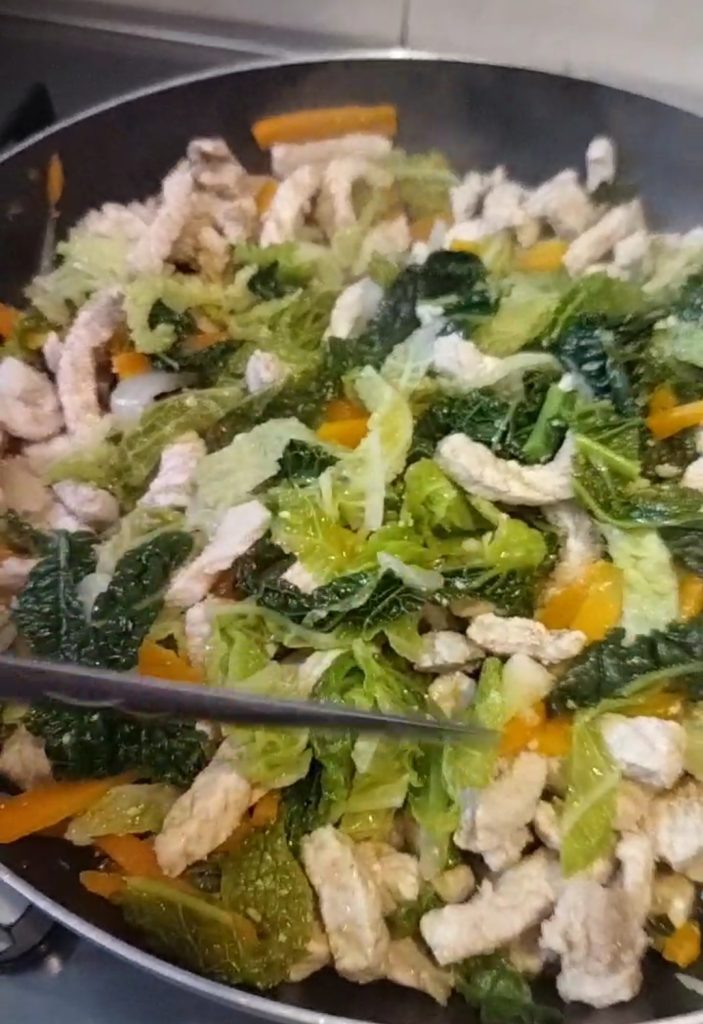 Jetzt waschen Sie den Kohl, entfernen Sie den härteren Strunk und die mittlere Rippe. Schneiden Sie den Kohl ebenfalls in Streifen und fügen Sie ihn zum Gemüse im Wok hinzu.