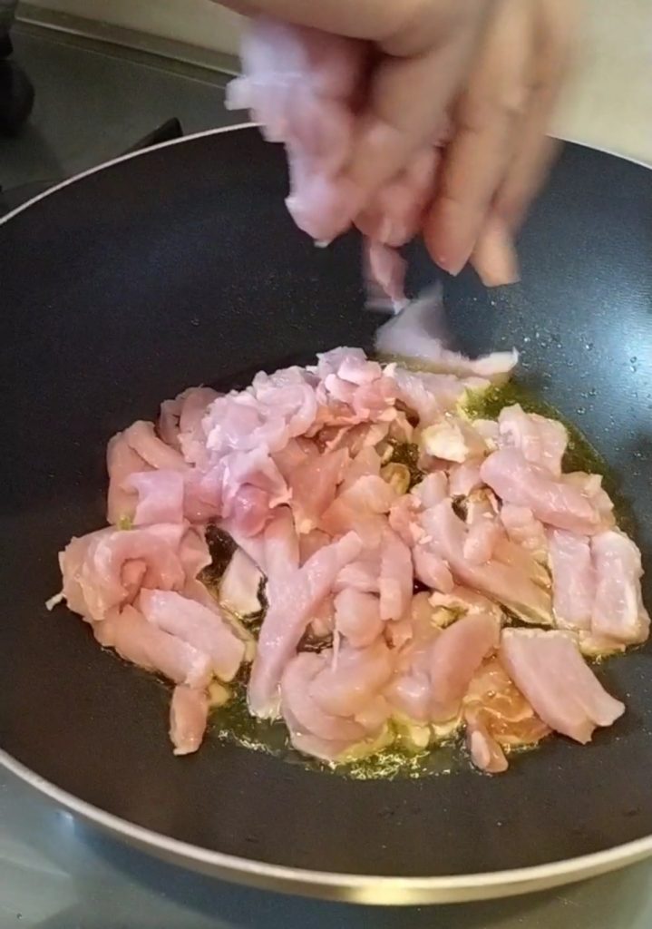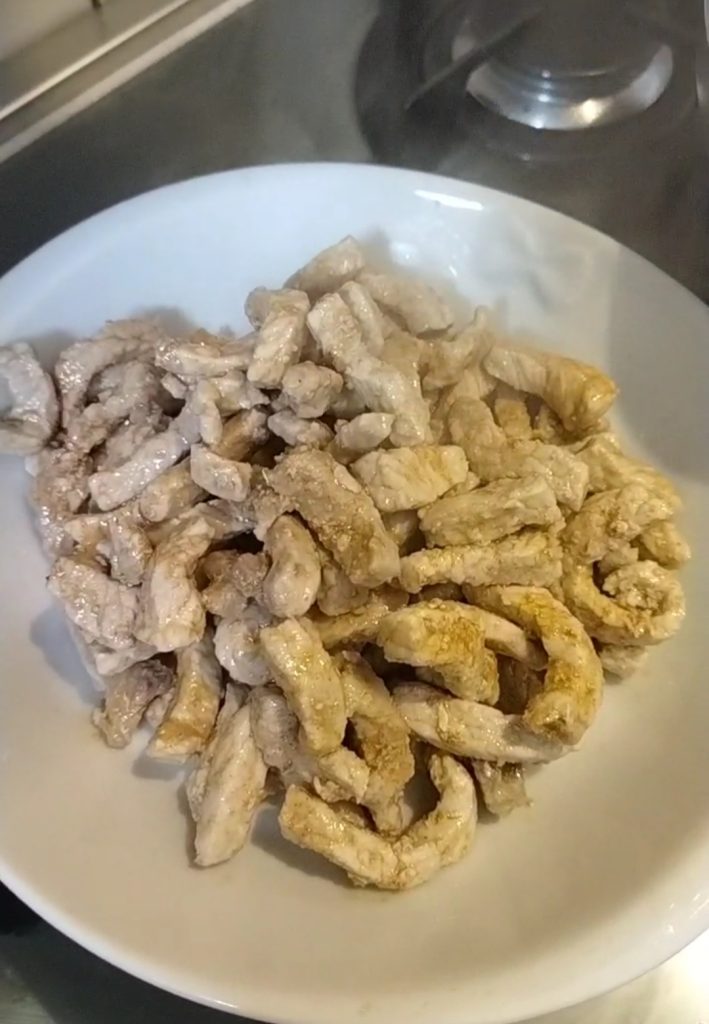 Wenn die Gnocchi verzehrfertig sind, können Sie mit der Zubereitung der Sauce fortfahren. Schneiden Sie die Schweinelende in Streifen und braten Sie sie in einem Wok, in dem Sie etwas Olivenöl gegeben haben.