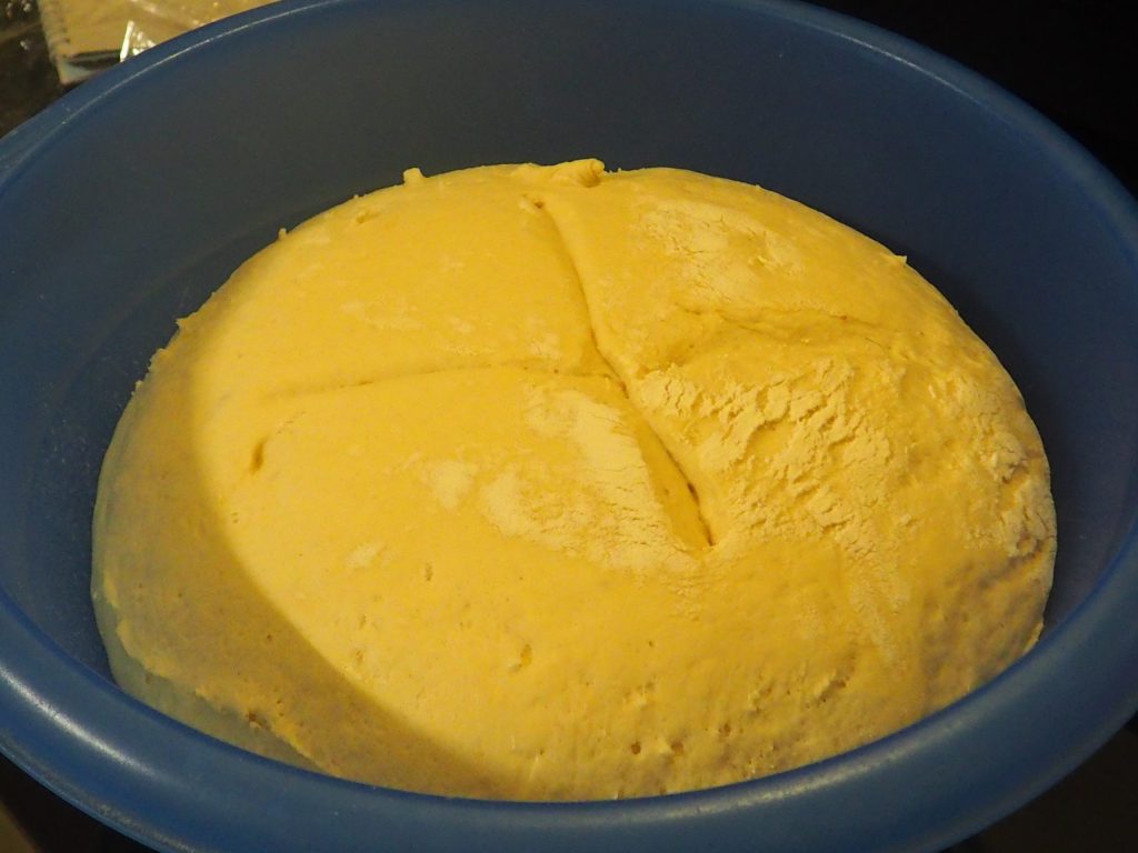 Legen Sie den Teig in eine bemehlte Schüssel, bedecken Sie ihn mit Frischhaltefolie, damit er nicht austrocknet, und lassen Sie ihn mindestens zwei Stunden gehen, er sollte mindestens verdoppeln. Falls notwendig, bedecken Sie alles mit einer Decke, um es wärmer zu halten.
