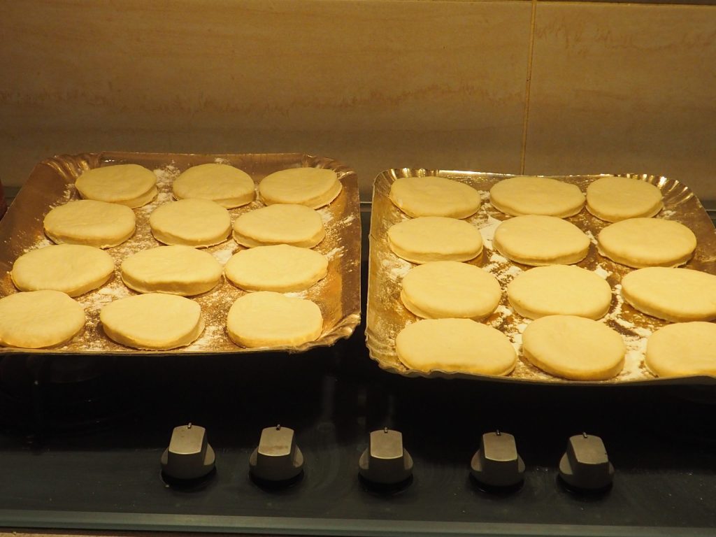 Mit einem Teigschneider mit einem Durchmesser von 9 cm schneiden Sie Scheiben heraus, etwa dreißig Stück.