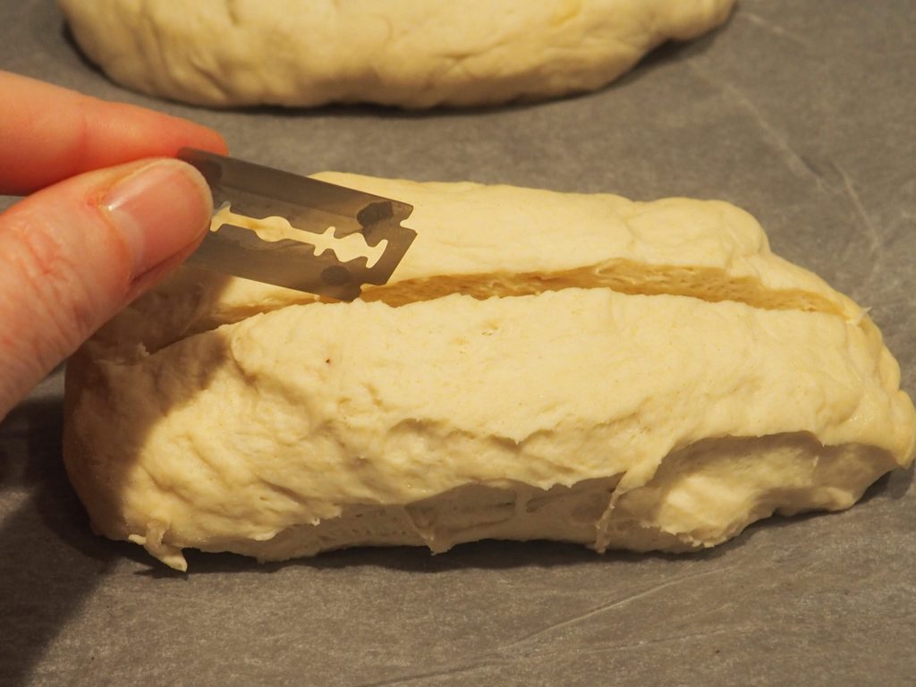 Lassen Sie sie so etwa 3 Stunden aufgehen. Nehmen Sie dann den Teigling, legen Sie ihn auf das mit Backpapier ausgelegte Backblech und schneiden Sie ihn mit der Rückseite eines langen Messers (oder dem speziellen Werkzeug zum Arbeiten mit Brot) in Längsrichtung in der Mitte durch. Drehen Sie den Teigling um, sodass der Schnitt jetzt oben ist.