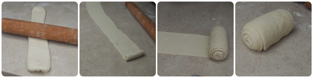 Rollen Sie jetzt den Zylinder mit dem Nudelholz aus, sodass ein langer schmaler Streifen entsteht (ich mache ihn normalerweise etwa einen Meter lang, aber Sie können ihn auch kürzer machen). Wickeln Sie ihn dann auf sich selbst, um einen Zylinder zu bilden.