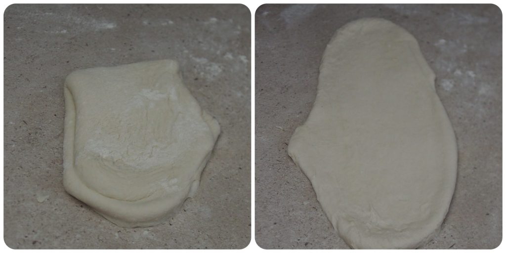 Nehmen Sie nun den Teig aus dem Behälter und legen Sie ihn auf eine bemehlte Arbeitsfläche. Rollen Sie ihn mit einem Nudelholz aus, falten Sie ihn zur Hälfte und rollen Sie ihn dann wieder aus, wiederholen Sie diesen Vorgang mindestens 6 oder 7 Mal. Dadurch entweicht die ganze Luft.