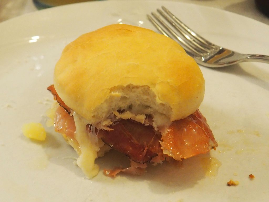 • Und nun stellen wir das Brötchen zusammen: Geschmolzenes Raclette, Aufschnitt, gekochte Kartoffel, kleine Zwiebeln und guten Appetit!