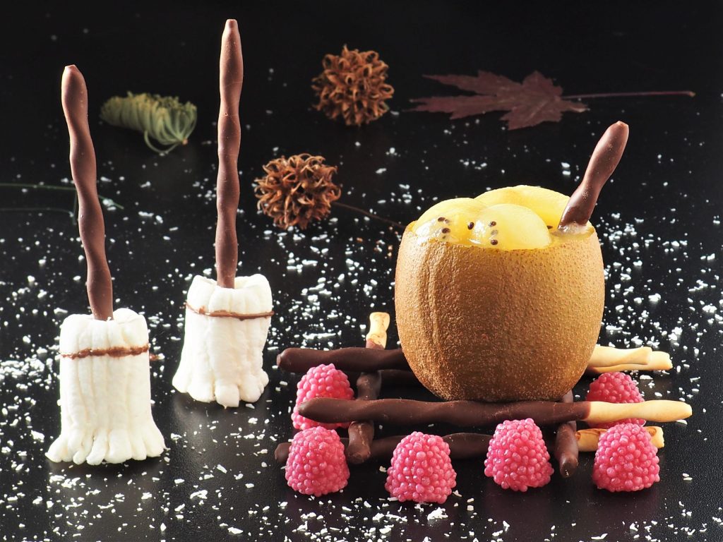 Die Schokoladen-Grissini wie kleine Stöckchen positionieren, die weichen Zuckerlollis drum herum als Feuer darstellen und die Kiwi oben als Kessel.
