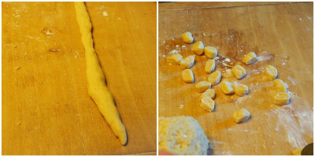 Aus dem Teig Streifen mit einem Durchmesser von ca. 2 cm formen, dann in ca. 2 cm lange Stücke schneiden.