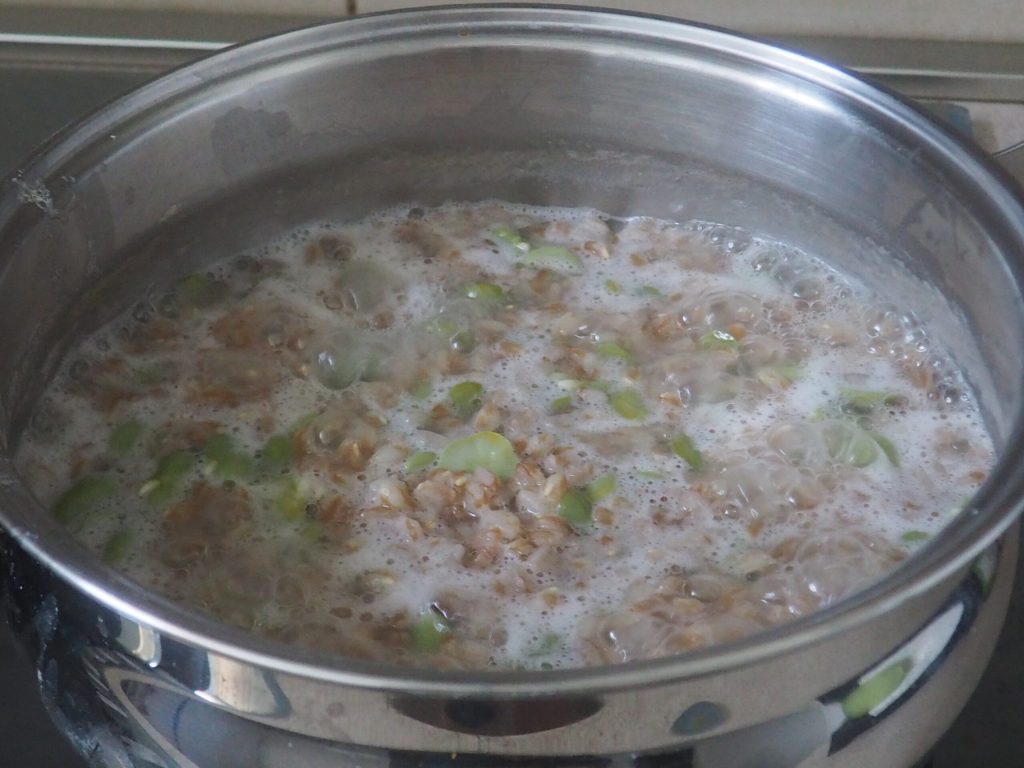 Geben Sie in einen Topf etwa 1,5 l Wasser, sobald es kocht, fügen Sie den Perldinkel und die geschälten Saubohnen hinzu. Kochen Sie es etwa 30 Minuten (folgen Sie den Anweisungen auf der Verpackung). Abgießen, abkühlen lassen und alles in eine große Schüssel geben.