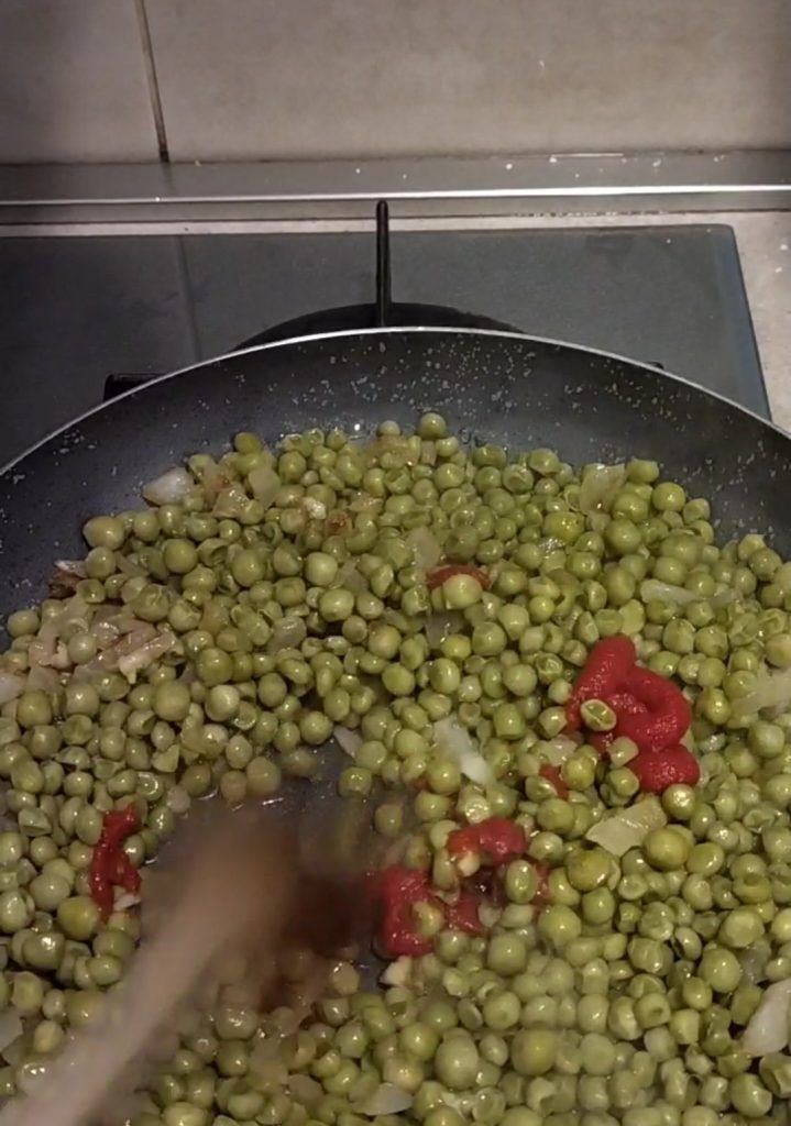 Die Erbsen in einem Topf mit Wasser, Salz und etwas Olivenöl kochen. Sobald sie gekocht sind, aber nicht zu weich, sollten sie noch etwas fest sein, sonst zerfallen sie. Abtropfen lassen. In einer Pfanne etwas Öl erhitzen und die zuvor gewaschene, geschälte und klein geschnittene Zwiebel anbraten. Zu diesem Zeitpunkt die Erbsen hinzufügen und etwa eine Minute kochen lassen.