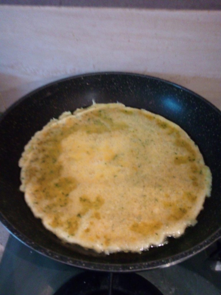 Sobald das Öl in der Pfanne heiß ist, die Eiermasse hineingießen und einige Minuten mit Deckel kochen lassen.