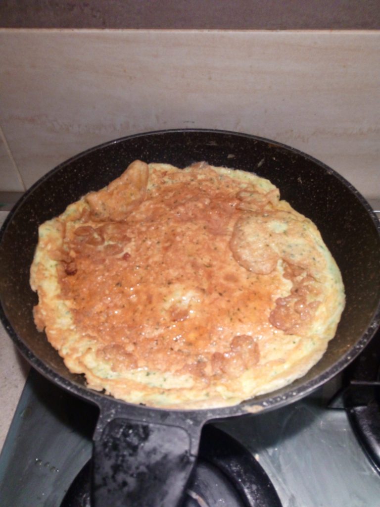 Dann die Pfanne umgekehrt über das Omelett halten und den Deckel umdrehen, um das Omelett auf der anderen Seite weiter zu garen.