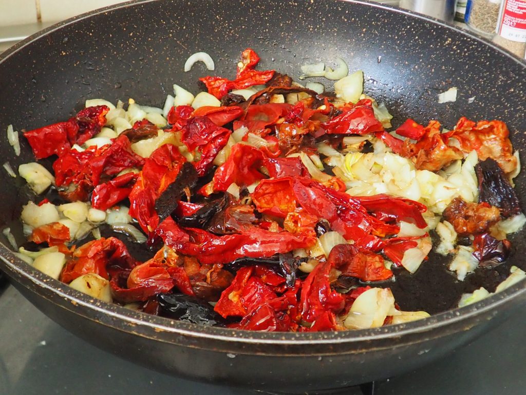Legen Sie sowohl die getrockneten Peperoni als auch die Zwiebeln für eine halbe Stunde in eine Schüssel mit kaltem Wasser.