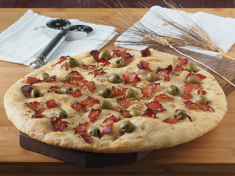 Bestreichen Sie die Oberfläche der Focaccia mit etwas Öl, wenn Sie möchten, fügen Sie etwas grobes Salz hinzu. Zerkleinern Sie den Schinken und verteilen Sie ihn auf der Focaccia, fügen Sie die grünen Oliven hinzu. Backen Sie bei 180° für 15 Minuten, im Umluftofen.