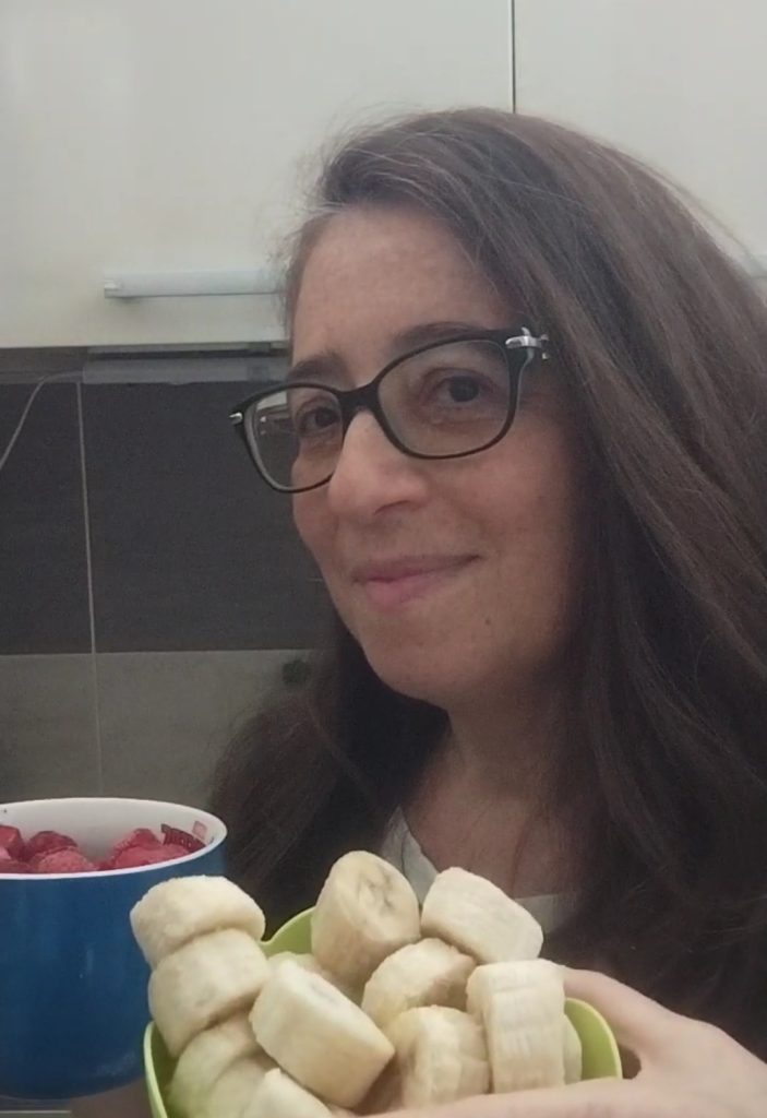 Schälen Sie die Bananen, schneiden Sie sie in nicht zu dicke Scheiben und frieren Sie sie in einem Behälter oder auf einem Tablett ein. Waschen, reinigen Sie die Erdbeeren, tupfen Sie sie mit Küchenpapier ab, um überschüssiges Wasser zu entfernen, schneiden Sie sie in kleine Stücke (in zwei oder vier Teile, je nach Größe) und legen Sie sie in eine Schüssel oder auf ein Tablett in den Gefrierschrank. Sie können sie ein paar Stunden bis über Nacht aufbewahren, es ist wichtig, dass sie fest sind, sonst erhalten Sie nicht den Eiseffekt.