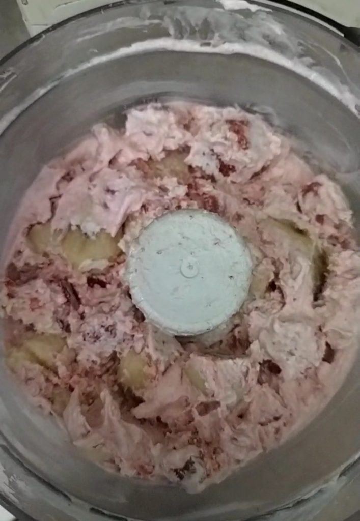 Wenn Sie frische und gesunde Eiscreme mögen, müssen Sie unbedingt dieses Fruchteis mit nur 3 Zutaten zubereiten: Banane, Erdbeere und gezuckerte Schlagsahne. Wir fanden es köstlich, cremig und eine echte Wohltat an diesen schwülen Tagen, Sie müssen nur die Geduld haben, zu warten, bis die Früchte gefroren sind.