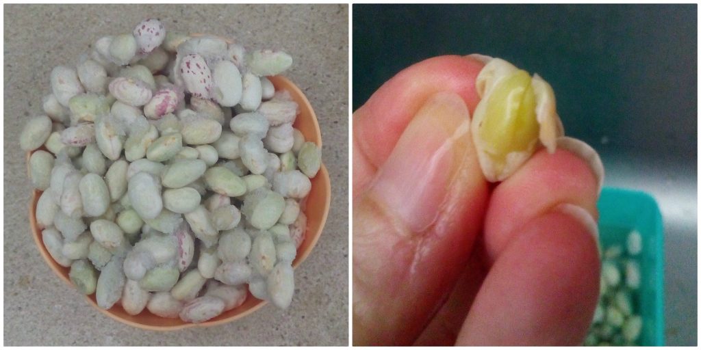 Zuerst müssen die Bohnen aus der Haut geschält werden. Das ist ein bisschen eine langwierige Aufgabe, aber die Creme wird dadurch flüssiger und homogener. Um diesen Vorgang zu erleichtern, empfehle ich, die Bohnen einzufrieren und kurz vor der Verwendung herauszunehmen, indem sie in lauwarmes Wasser gelegt werden, um sie aufzutauen. Auf diese Weise lässt sich die Haut sehr leicht entfernen.