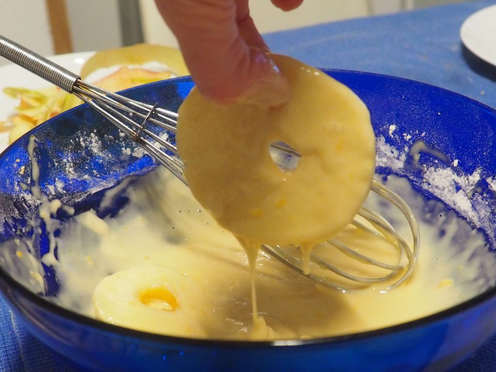 Tauchen Sie die Apfelscheiben in den Teig, drehen Sie sie mit einem Löffel und bedecken Sie sie gut.