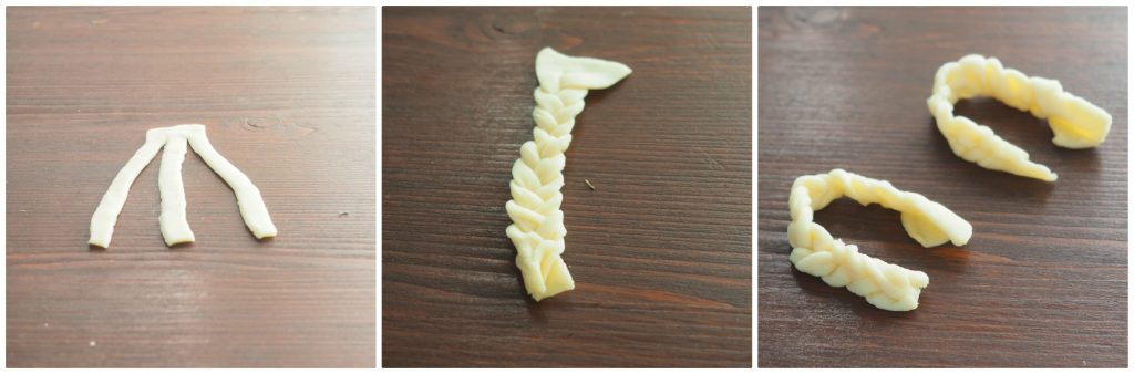 Teilen Sie jeden Streifen in 3 Teile, achten Sie darauf, ein Ende nicht zu schneiden, und gestalten Sie kleine Zöpfe.