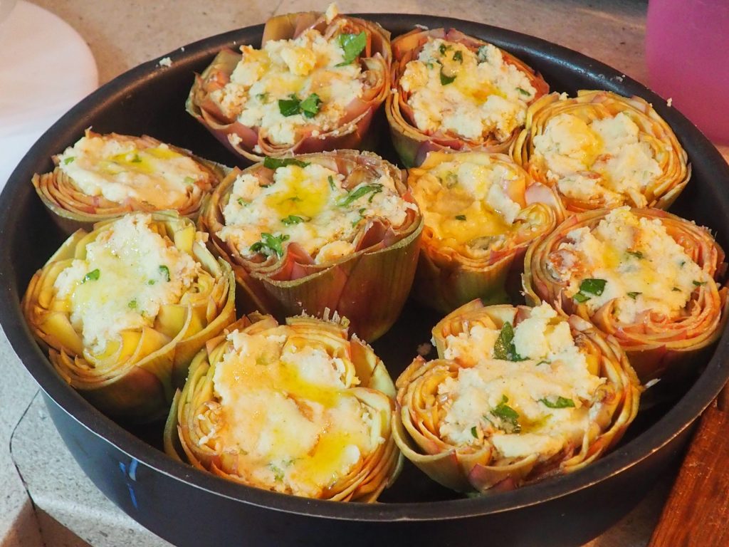 Füllen Sie das Innere der Artischocken mit der Mischung, beträufeln Sie die Oberfläche mit etwas Öl, legen Sie sie in eine Backform mit einem Durchmesser von 26 cm mit einem Zentimeter Wasser am Boden, stellen Sie die Form auf das zweite Fach des Ofens von unten und backen Sie sie bei 180° für etwa 25 Minuten.