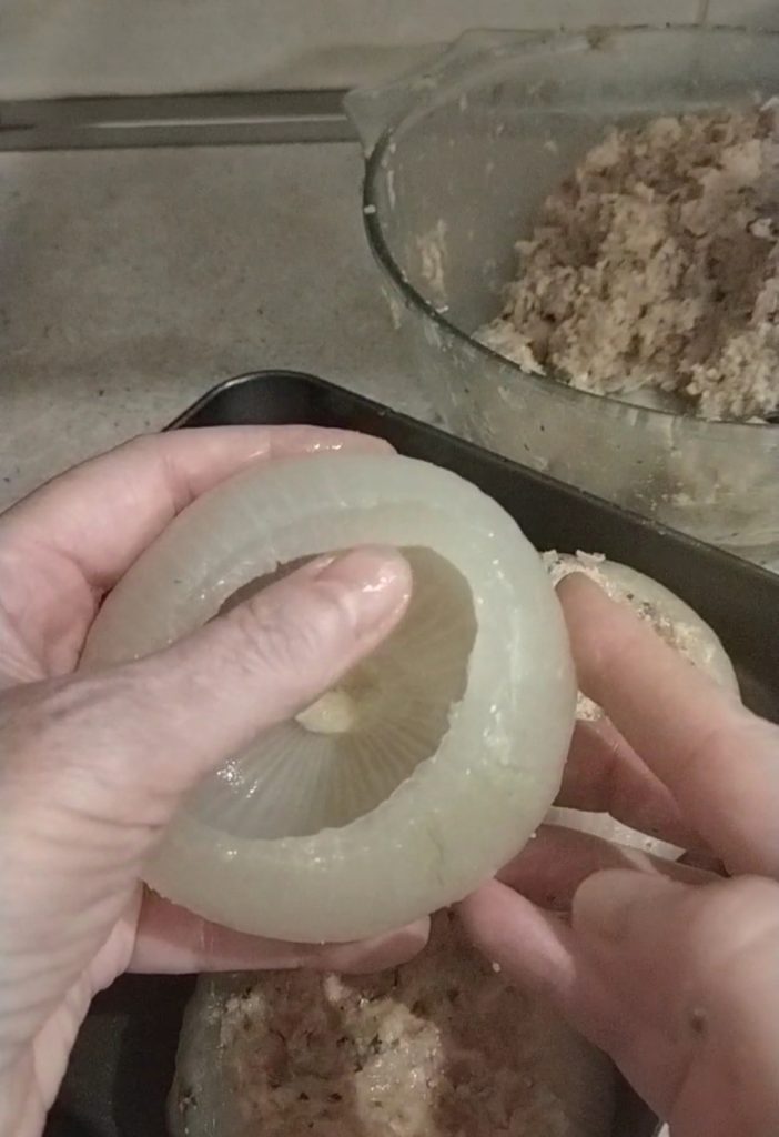 Ich habe etwa 1 kg Füllung erhalten, mit 500 g habe ich die 4 äußeren Zwiebelschalen gefüllt, mit dem Rest weitere 8-9 kleinere Ringe, aus dem Inneren der Zwiebel genommen.