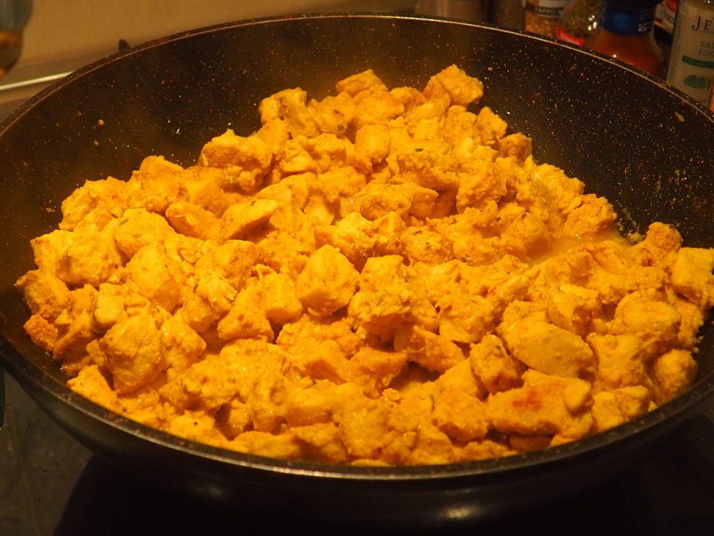 Jetzt geben Sie die Hähnchenwürfel in die Joghurtsoße, mischen Sie sie, damit sie vollständig mit der Soße bedeckt sind, decken Sie die Schüssel mit Frischhaltefolie ab und lassen Sie sie mindestens eine Stunde im Kühlschrank marinieren. Wenn Sie keine Zeit haben, können Sie es auch nur für eine Viertelstunde lassen, das Fleisch wird etwas weniger Geschmack annehmen, ist aber trotzdem lecker.