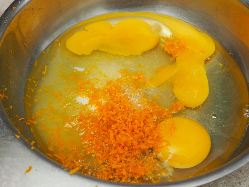 Geben Sie den Zucker, die Eier, die geriebene Orangenschale und das Vanillin in eine Schüssel und schlagen Sie alles gut mit einem Schneebesen.