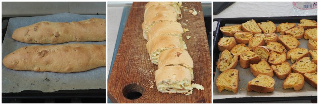 Nehmen Sie die beiden Rollen heraus, schneiden Sie sie in etwa einen Zentimeter dicke Stücke, legen Sie die Scheiben erneut auf das Backblech und lassen Sie sie auf beiden Seiten bei 180°C für 3-4 Minuten pro Seite bräunen.