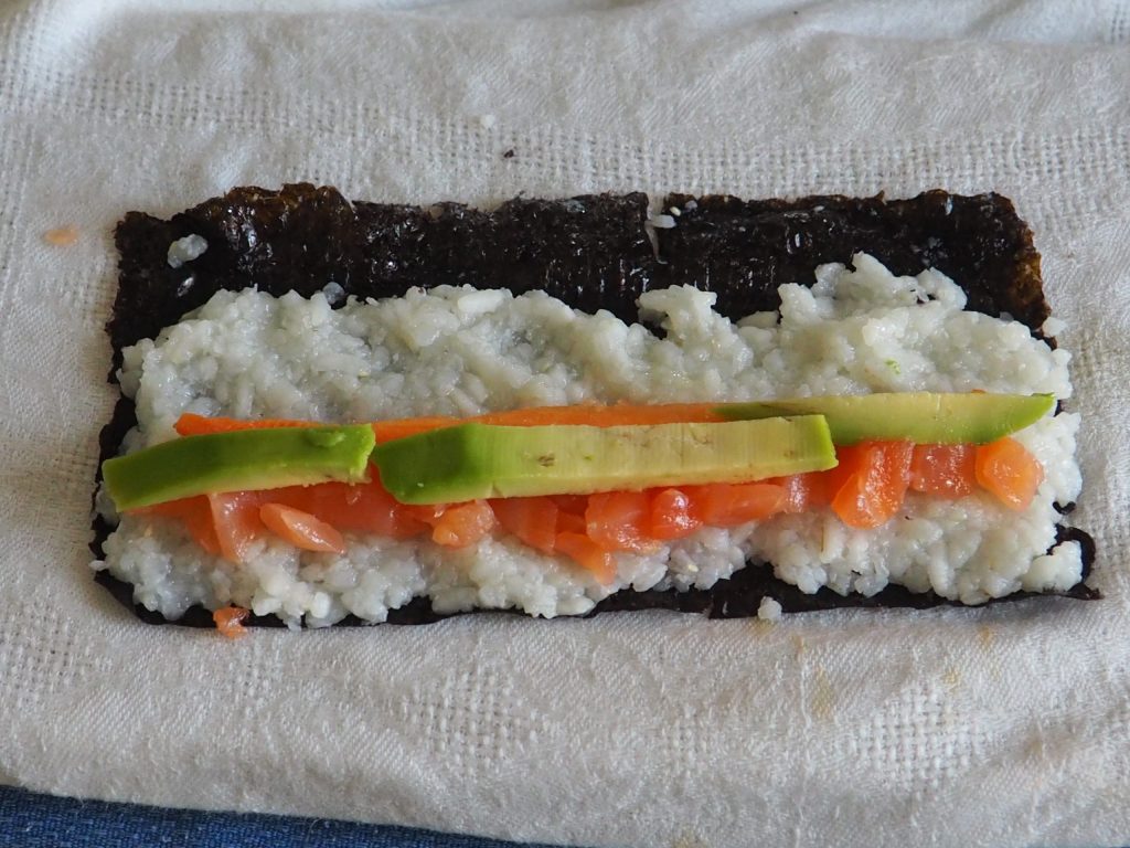 Drehen Sie es um (sodass der Reis nun auf dem Tuch liegt) und legen Sie oben Lachs, geschälte und gewaschene Karotten und in Streifen geschnittene Avocado.